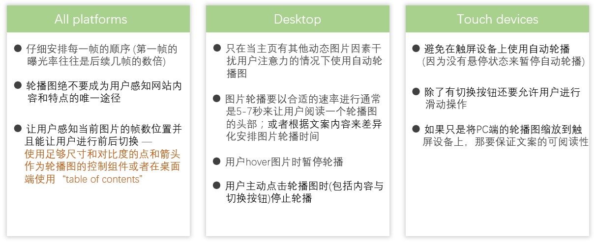 我們之前做的輪播圖可用性研究,發現大部分用戶會在輪播圖自動輪播完一個輪回前就跳到另一個頁面了,而在手動輪播圖網站里輪播圖只會停留在第一幀,除非用戶主動去找不然他們不會注意到那些有用的信息。所以,即使完善輪播圖的細節設計是一個很好的想法,但這并不能成為用戶獲取網站信息的唯一方式。