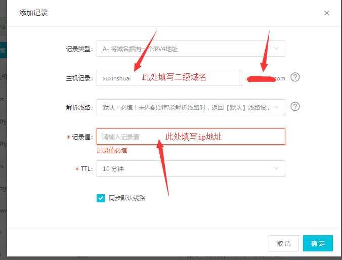 2、點擊添加記錄后,根據(jù)所彈窗給出的框條寫上即可,記錄類型選擇A即可,主機記錄可以看旁邊的一個問號有所提示,根據(jù)自己所需填寫,最后就是記錄值,填寫你的服務(wù)器IP或者空間IP即可,在確定就完成了二級域名設(shè)置。